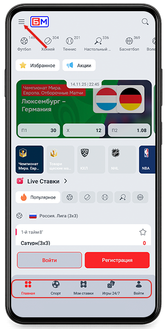 После входа вы увидите главный экран с топовыми событиями и ближайшими матчами. В нижней части дисплея находится основное меню, которое содержит пять разделов: