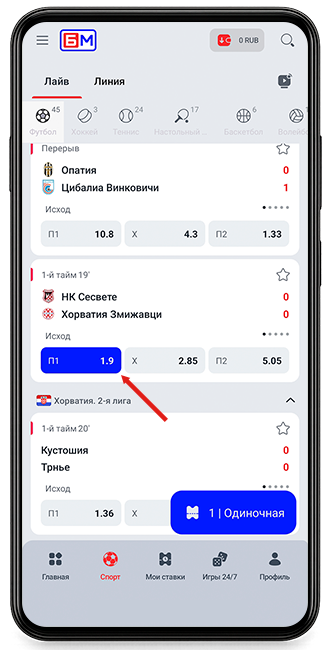- Перейдите в раздел Спорт или в категорию Лайв/Линия.