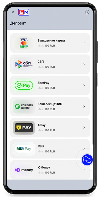 Верхняя часть экрана включает кнопку «Депозит», а иконка чата поддержки появляется при необходимости.