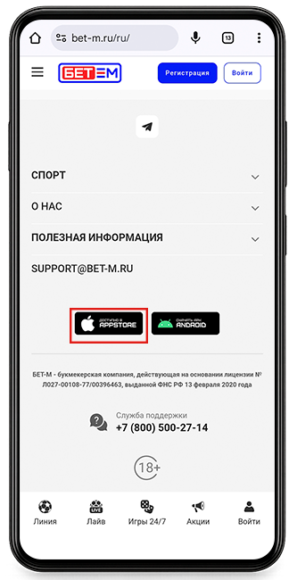 Чтобы установить приложение с сайта, зайдите на Bet‑M и прокрутите страницу вниз. Там вы увидите значок iOS. Нажав на него, вы автоматически перейдёте на страницу приложения в App Store, где можно загрузить программу.