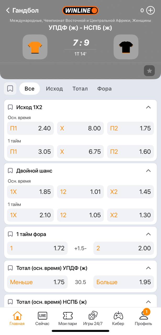 Рассмотрим реальный live-матч из букмекерской линии. На момент анализа идёт первый тайм, счёт 7:9, сыграно около 14 минут.