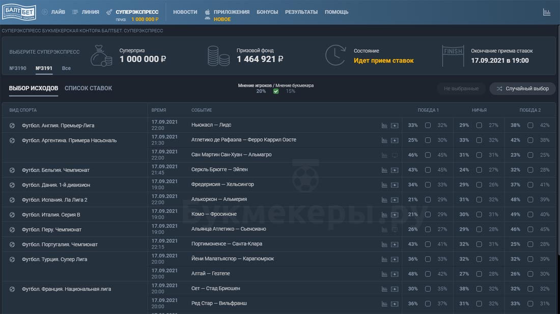 Прежде всего нужно авторизоваться в БК Балтбет ру. Доступна как новая, так и старая версия сайта. Кроме того, можно зайти через мобильное приложение. Раздел Супер экспресс Балт Бет находится вверху главной страницы рядом с линией, Live и новостями. Здесь игрок заполняет купон из 15 событий, желающим сделать прогноз без лишних усилий доступна опция «Случайный выбор». После ее активации программа сама выберет 15 обязательных пари.