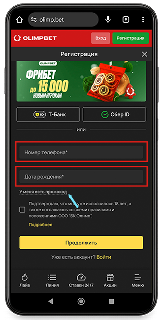 - Через приложение для смартфонов, которое можно скачать на сайте Олимп. Процесс регистрации такой же, как и на сайте — указываете мобильный номер телефона, дату рождения, промокод и соглашаетесь с правилами. После этого вводите полученный проверочный код. Останется только подтвердить личность, поплнить счет и можно приступать к ставкам.
