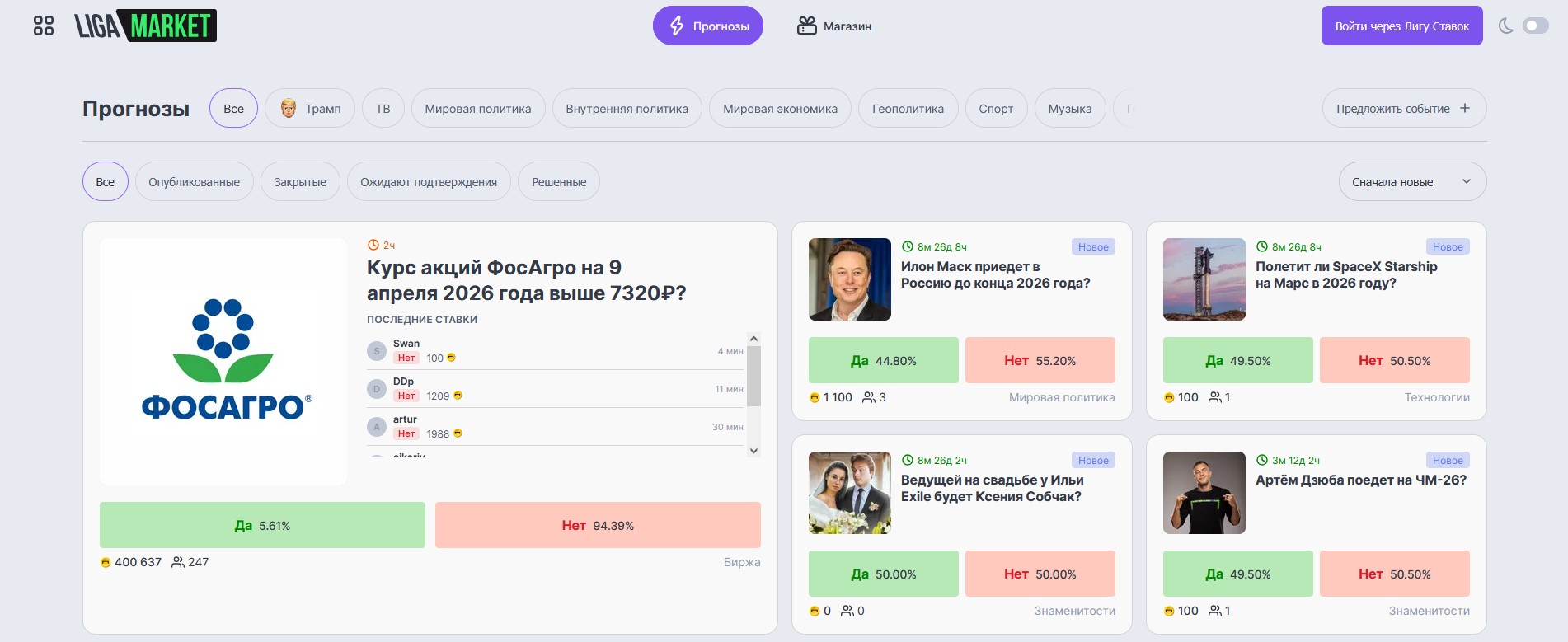 «Лига Ставок» запустила собственную бесплатную платформу прогнозов под названием «Лига Маркет», похожую на Polymarket. На сайте можно делать прогнозы на спортивные, культурные, политические и другие события.
